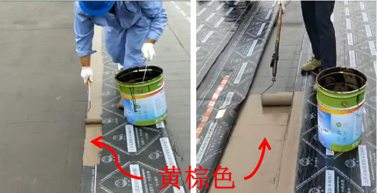 在上述基礎(chǔ)上,將貼必粘開桶攪勻,對大面積基面采用滾筒將貼必粘在預(yù)鋪卷材的范圍內(nèi),把貼必粘滾涂在基面上,同時對卷材的長邊、短邊搭接部位也進行涂刷,要求均勻、無漏刷、不堆積(注:貼必粘剛開始涂刷時呈黃棕色)。(如圖)
